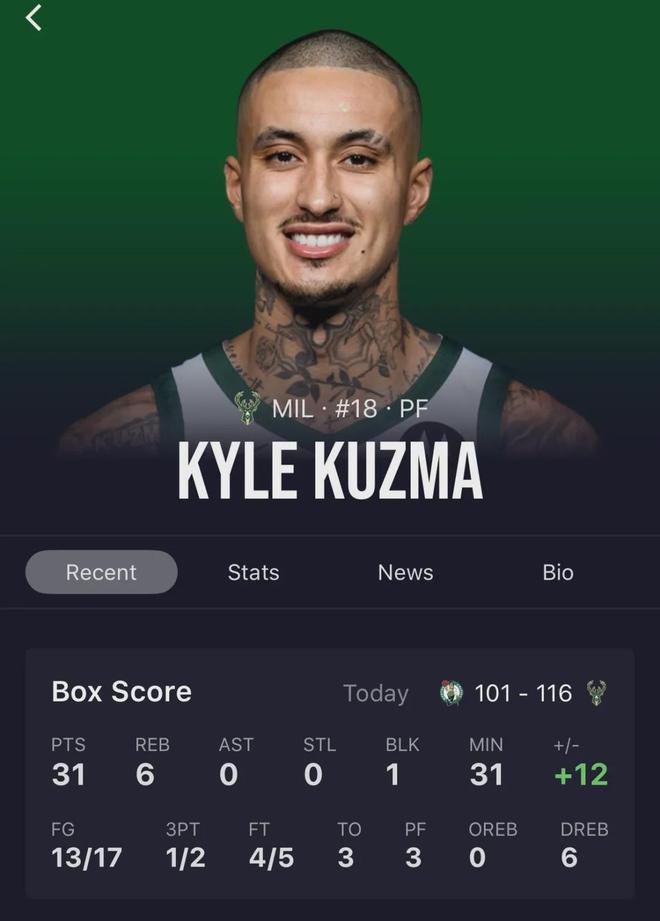 2025年12月12日 雄鹿逆转绿军 库兹马31+6 小波特三双 杰伦·布朗空砍30分